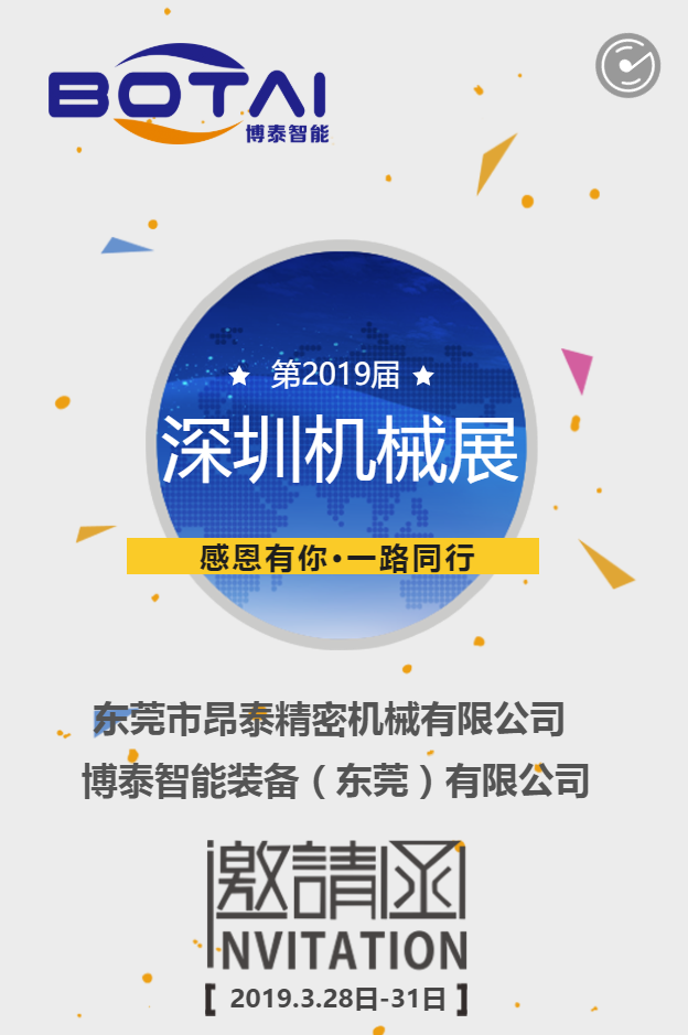 第20屆深圳國(guó)際機(jī)械制造工業(yè)展覽會(huì) 地址:中國(guó).深圳會(huì)展中心 展位:8號(hào)館 8C49 現(xiàn)誠(chéng)邀閣下于2019年3月28日至31日蒞臨我司展臺(tái) 參觀感謝您的支持 金年會(huì)智能裝備(東莞)有限公司