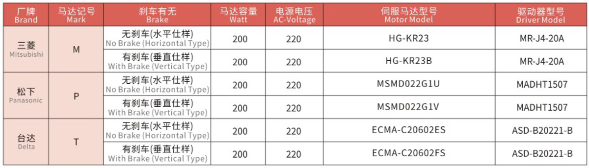 搭配伺服馬達(dá)一覽表